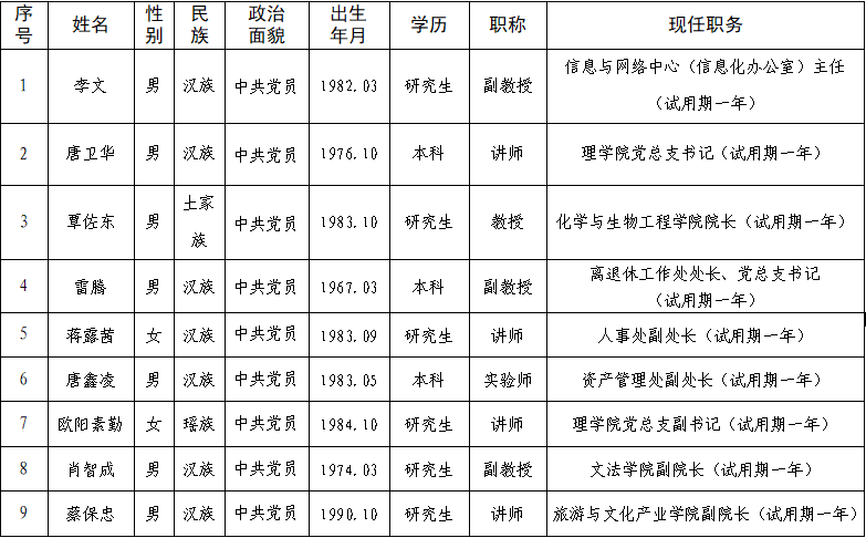根据《党政领导干部选拔任用工作条例》《党政领导干部任职试用期暂行规定》《湖南科技学院中层领导干部选拔任用工作实施办法(修订)》等文件规定,经学校党委研究决定,将成立考察组对李文等9名试用期满的干部进行考察,特发布考察预告。
