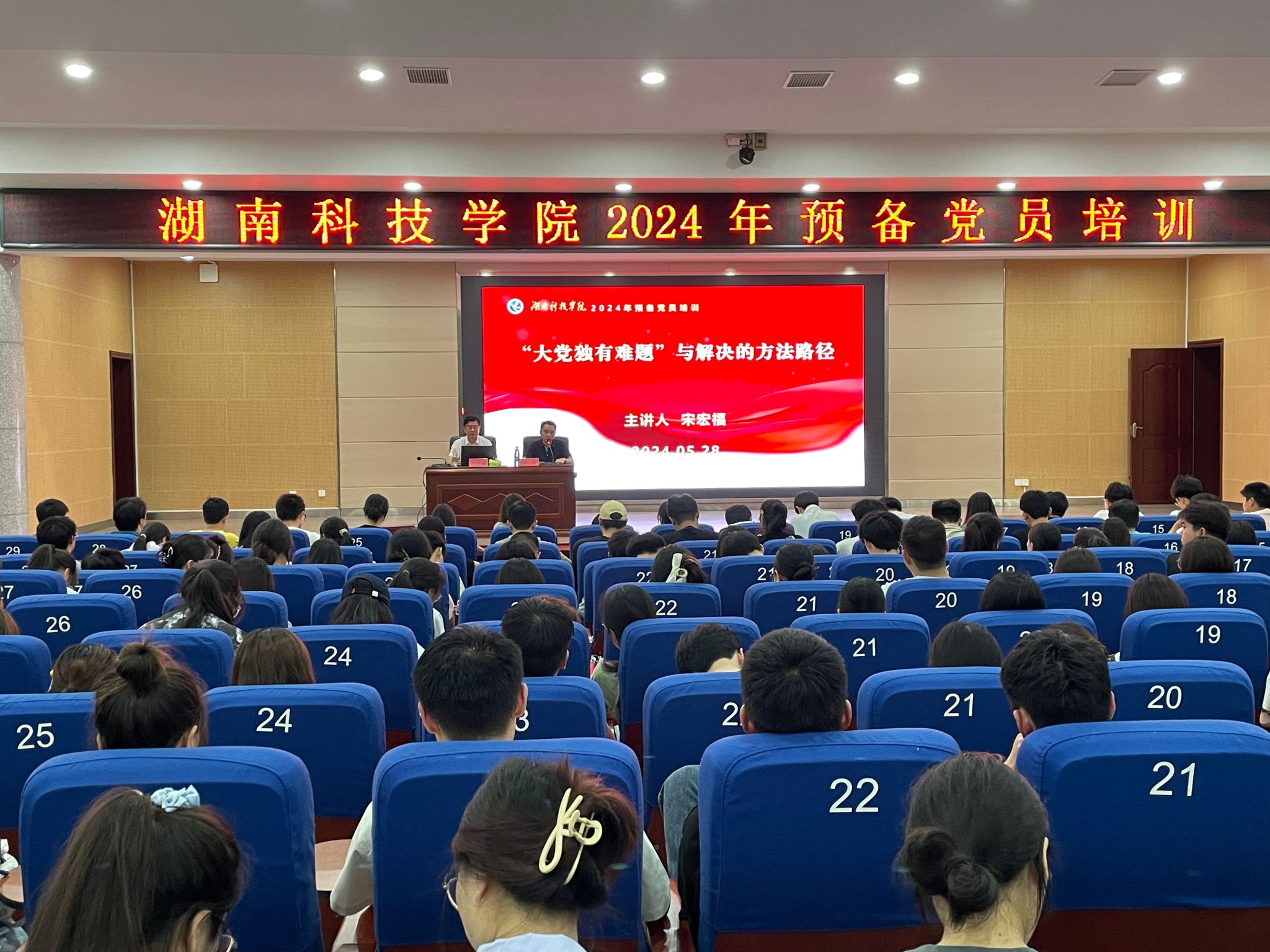 为进一步加强预备党员教育培养,帮助预备党员从思想上入党,早日成为符合标准的正式党员,学校党校特开展2024年预备党员培训班。5月28日晚,校党委副书记、党校校长、宣传统战部部长宋宏福同志在潇湘大讲堂为418名预备党员讲授第一课《“大党独有难题”与解决的方法路径》,培训会由校党委组织部副部长、党校副校长刘铮同志主持。